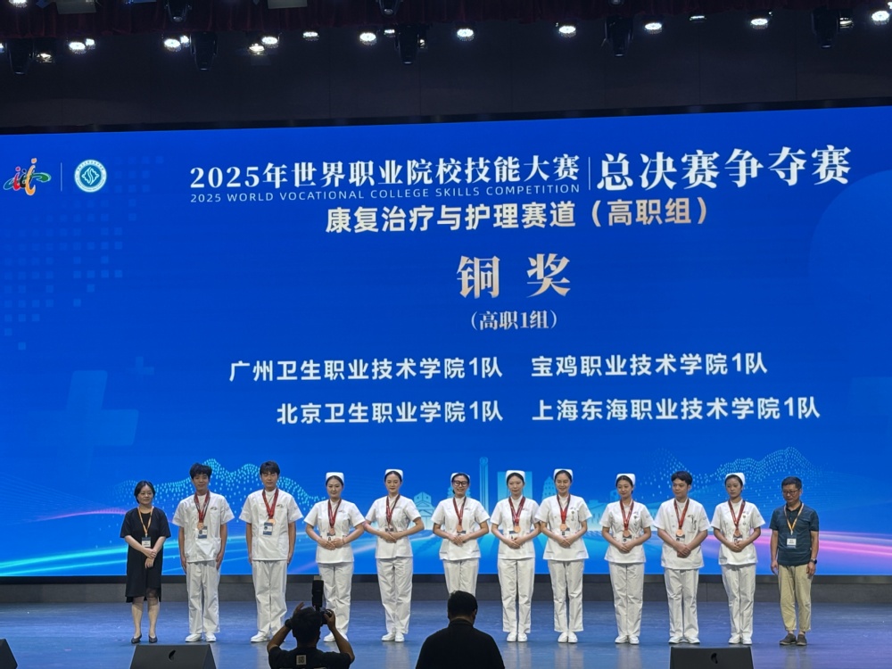 近日,2025年世界职业院校技能大赛总决赛争夺赛康复治疗和护理赛道(高职组)落下帷幕,上海东海职业技术学院护理学院麻嘉兴、吴航翔、沈安欣、李佳凝4位同学凭借扎实的专业技能和严谨的职业态度,斩获铜奖,为学校争光添彩。