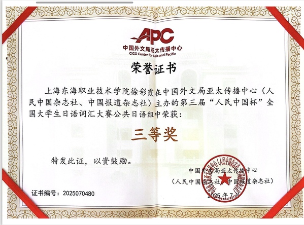 在刚刚落下帷幕的第三届“人民中国杯”大学生日语词汇大赛中,我校学子表现优异,斩获多项荣誉。我校三名同学凭借扎实的日语词汇功底与出色的现场发挥,在激烈竞争中脱颖而出。其中,护理2311班吴谷(指导教师:储然)荣获一等奖;影视241班徐彩霞(指导教师:冬梅)、动画232班徐昕(指导教师:储然)获得三等奖;动画2401班温馨、动画22401班陈卓妍以及计技22401班李嘉诚三位同学获得优秀奖。他们的优异表现为学校赢得了荣誉。