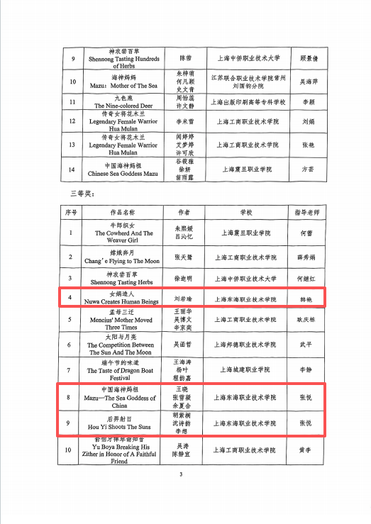 在张悦老师的精心指导下,多部作品脱颖而出。邵安琪、郭美汝、胡雅雯创作的《精卫填海》(Jing Wei Filling The Sea)以生动的画面和流畅的外语荣获一等奖;钱亮亮、沈喆斌、冯天路的《开天辟地》(The Creation of The World)荣获二等奖;王晓、张雪凝、余夏合的《中国海神妈祖》(Mazu-The Sea Goddess of China)及胡紫桐、沈诗韵、李想的《后羿射日》(Hou Yi Shoots The Suns)荣获三等奖,韩艳老师指导的刘若瑜作品《女娲造人》(Nuwa Creates Human Beings)也荣获三等奖。