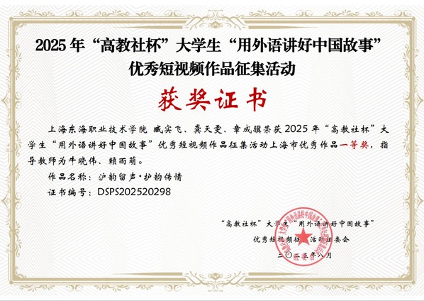 在2025年“高教社”杯大学生“用外语讲好中国故事”优秀短视频作品征集活动中,东海学子凭借深厚的文化底蕴与出色的外语表达能力崭露头角,由汽修231班臧实飞、汽修231班龚天雯、机电2403班章成骥组成的团队(指导老师为牛晓伟和赖雨萌)创作的短视频作品《沪韵留声・护韵传情》(Preserving Hu Opera: A Cultural Bridge Between Past and Future)荣获上海市一等奖,充分彰显了学校在外语实践教学与中华优秀传统文化传承融合领域的卓越成果。