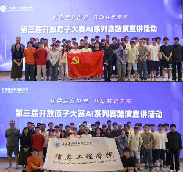 2025年9月26日下午,为主动对接行业前沿技术,拓展学生创新实践平台,信息工程学院党支部联合“八音・和”一站式学生社区,组织学院师生代表一行43人,赴上海市徐汇区华鑫慧享中心,参加了由开放原子开源基金会主办的“第三届开放原子大赛AI系列赛”路演宣讲活动。本次活动由学院党支部书记张春艳带队,成员包括党员教师、入党积极分子及团员代表。