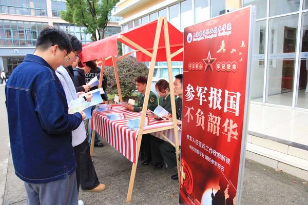 为深入贯彻习近平强军思想,积极响应国家强化国防和军队建设的号召,进一步引导和激发大学生投身军营,报效祖国。11月7日中午,校武装部联合闵行区人武部开展2026年上半年征兵现场咨询活动,闵行区人武部工作人员现场就相关报名条件和征兵政策等内容,为我校学生进行答疑解惑。