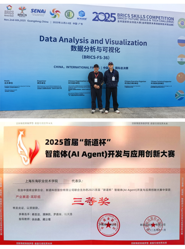11月5日,在广东建设职业技术学院举行的2025年金砖国家职业技能大赛数据分析与可视化赛项国际总决赛中,计算机应用技术中高职贯通班学生魏嘉宝在教师徐焱鑫的指导下,从来自中国、俄罗斯、印度等9个国家的多支精英队伍中脱颖而出,勇夺国际总决赛三等奖,为学校赢得了国际荣誉。