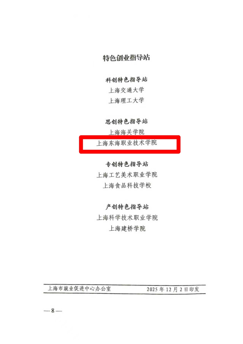 根据上海市就业促进中心办公室2025年12月2日印发的文件,上海东海职业技术学院被认定为“思创特色创业指导站”。此次评选共设立四大特色类别,包括科创、思创、专创和产创特色指导站。我校凭借在创新创业教育方面的特色成果,成功入选“思创特色指导站”,与上海海关学院一同成为获此殊荣的两所院校之一。