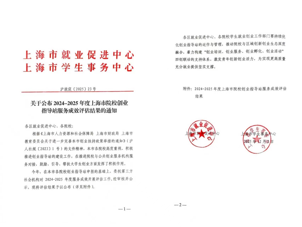 在刚刚公布的2024-2025年度上海市院校创业指导站评估结果中,我校与复旦大学、上海大学等35所院校共同荣获“达标B级”认定。本次评估共有87所本科类、高职类、中职类院校参加评审,评估体系涵盖创业教育、创业服务等多个维度,全面考察院校创业指导站创新创业工作的推进情况。