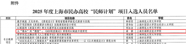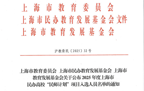 近日,由上海市教育委员会、上海市民办教育发展基金会和上海市教育发展基金会联合举办的2025年上海市民办高校教师专项培育计划项目(简称“民师计划”)公布评审结果,我校经管学院高静、李庆华,马克思主义学院张瑞杰三位教师成功入选。
