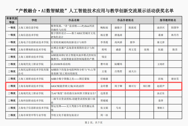 近日,由长三角电子信息职业教育集团、上海市高等职业院校电子与信息类专业教学指导委员会等单位联合主办的“产教融合·AI数智赋能”人工智能技术应用与教学创新交流展示活动圆满落幕。来自31所职业院校的132件作品同台竞技。教育学院教师团队凭借扎实的专业素养和突出的教学创新能力脱颖而出,共斩获二等奖2项、三等奖6项,充分展现了教育学院在人工智能技术与教育教学深度融合方面的探索成果与综合实力。