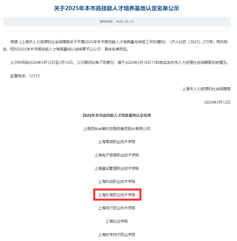 根据《上海市人力资源和社会保障局关于开展2025年本市高技能人才培养基地申报工作的通知》(沪人社职〔2025〕270号)相关规定,上海市人力资源和社会保障局会认定上海东海职业技术学院为2025年上海市高技能人才培养基地建设单位。