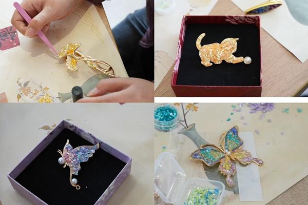 螺钿工艺,作为中国传统的装饰艺术,历史悠久,其利用螺壳、海贝等天然材料的色泽与纹理,镶嵌成精美的图案,光彩夺目,独具匠心。活动现场,指导老师精心准备了各式各样的螺钿片、胸针、发簪、发夹底托、胶水、镊子等材料。在指导老师的详细讲解和示范下,大家首先了解了螺钿工艺的历史渊源、艺术特点及制作技巧。从选材、构图、拼贴到固定封层,每一步都蕴含着匠心与巧思。女教职工们此刻都化身手作匠人,全神贯注地投入到创作中。她们或细心挑选色彩斑斓的螺钿片,或精心设计图案布局,或小心翼翼地用镊子将细小的螺钿片粘贴在胸针底座上。现场气氛轻松温馨,大家时而互相交流探讨,时而凝神专注创作,欢声笑语与指尖的艺术创作交织在一起。