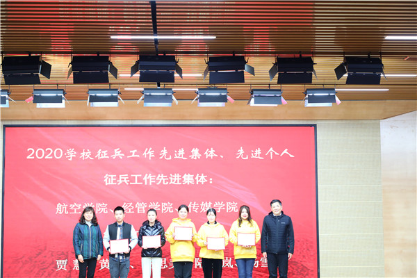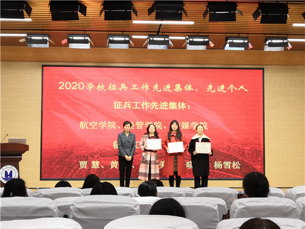 副校长郁萍宣读了表彰征兵工作先进集体和先进个人的决定。航空学院、经管学院、传媒学院荣获2020年征兵工作先进集体称号,辅导员贾慧、黄颖、王思美、陆晓岚、杨雪松荣获2020年征兵工作先进个人称号。校领导分别为获奖集体和个人颁奖。航空学院学工办主任葛徐艳、辅导员贾慧和艺术学院辅导员杨雪松分别作了交流发言,分享了在征兵工作中的经验。