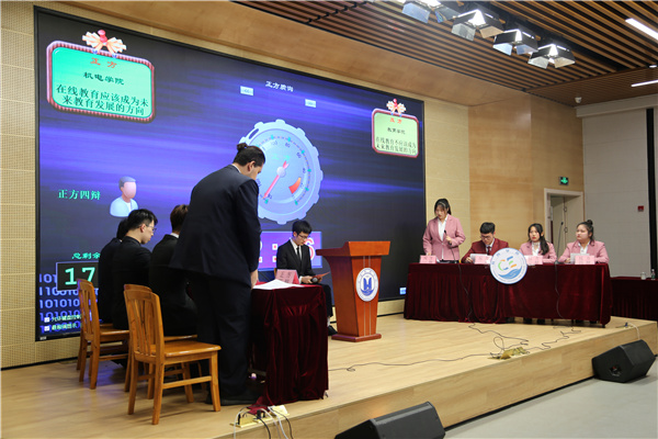 辩论赛共分初赛、复赛、决赛三部分。本场初赛有幸邀请到了学工部副部长王莉娜、学工部新疆办主任孔国锋以及校团委干事唐顺担任评委。即使还只是在初赛阶段,赛场气氛紧张热烈不输决赛。第一场为传媒学院和航空学院围绕“精神赡养老人主要依靠道德/法律保障”辩题展开辩论。双方辩手你来我往、侃侃而谈,场下观众激情澎湃、掌声连连响起。第二场比赛为机电学院对战教育学院。双方队伍围绕“在线教育应该/不应该成为未来教育发展的方向”展开辩论。两支队伍乘风破浪,气势如虹,自由辩论环节将比赛气氛再次推向高潮,现场气氛迅速升温,精彩不停,掌声不断。最后,经过激烈的比赛和评委们公正的评判,传媒学院、机电学院获得了初赛的胜利。