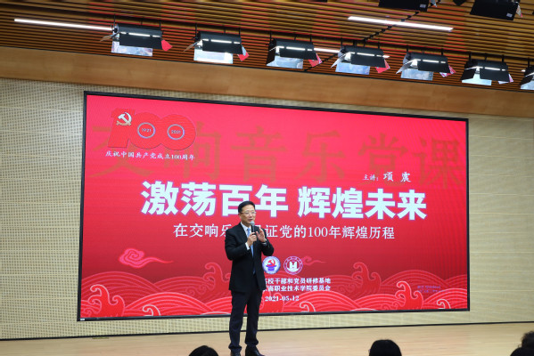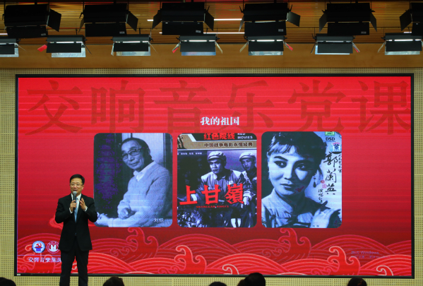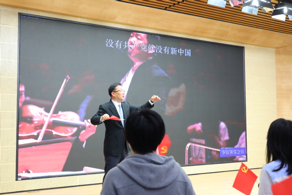 讲座中,项震用交响乐串起了一条波澜壮阔的时代线索,党史在旋律中展现,情感在乐曲中升华。一曲庄严、雄浑的《国际歌》拉开了音乐党课的序幕,热情讴歌了巴黎公社战士崇高的共产主义理想和英勇不屈的革命气概,充分表现了革命无产阶级不屈的豪迈气魄;《长征交响曲》第五乐章描绘了中国革命史上的长征时期的艰苦岁月和光辉历程;《我的祖国》表达了抗美援朝战争时期,志愿军战士对祖国、对家乡的无限热爱和英雄气概;《黄河大合唱》展现了抗日战争壮丽图景;《激情燃烧的岁月》展现了新中国成立后的时代特征;激昂奋进的《红旗颂》热情赞颂党的光辉历程和丰功伟绩;《我爱你中国》展现了改革开放时期,党团结带领全国各族人民成功开创历史性跨越, 表达中国人民对祖国的热爱之情;《金声玉振》《河西走廊之梦》《心上丝路》描绘了党的十八大、十九大以来,在习近平新时代中国特色社会主义思想的指引下,中华民族伟大复兴向前迈出了新的一大步,迎来了从站起来、富起来到强起来的伟大飞跃。最后,大家集体起立,挥舞着党旗,一起高歌《没有共产党就没有新中国》。