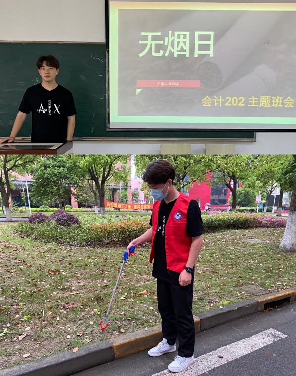 他积极参与学院包干区禁烟巡查、“无烟无味寝室”巡查工作,截止5月下旬共参与巡查工作20次,累计20小时。主要开展禁烟包干区巡查,提醒、劝阻校园内违规吸烟的同学。定期进行寝室巡查,宣传“无烟无味寝室”。另外,他组织召开班级禁烟主题班会,签订告知书,并制作禁烟短视频。
