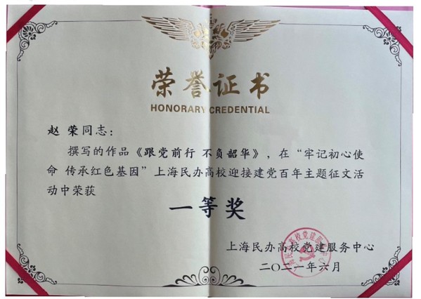 日前,上海民办高校党建服务中心公布了上海民办高校迎接建党百年主题征文获奖名单,我校推荐的七名师生的七篇征文获奖,其中航空学院辅导员赵荣的征文《跟党前行,不负韶华》获一等奖,机电学院学生朱晓天征文《诵一本百年的史诗》获二等奖,基础部教师张霄汉、社科部教师陈飞、护理学院辅导员冯亚男、经管学院学生何依繁、艺术设计学院学生黄天娇等五位师生的作品荣获优秀奖。