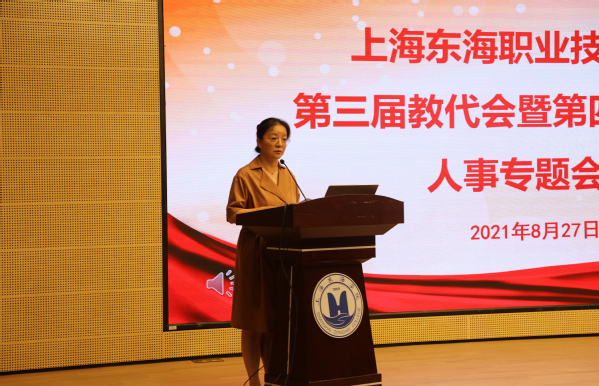827日上午,上海东海职业技术学院第三届教代会暨第四届工代会人事专题会议在匠兴苑学术报告厅召开,教工代表80余人参加,副校长郁萍主持会议。