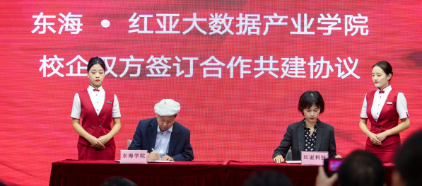 东海传媒学院院长王平和赵晨伊女士签订产业学院合作共建协议。在全场与会人员的关注下,马建超处长、徐国庆教授、赵晨伊女士和东海学院领导班子共同按下产业学院成立的启动球,东海红亚大数据产业学院正式成立。