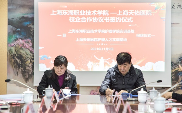 11月9日,上海东海职业技术学院——上海天佑医院校企合作签约仪式暨“上海东海职业技术学院护理学院实训基地”“上海天佑医院护理人才实训基地”揭牌仪式在我校南807会议室举行。上海蓝生脑科医院投资股份有限公司副总裁叶文琴,上海天佑医院院长蔡剑飞、执行院长王强,上海蓝生脑科医院投资股份有限公司医疗管理部培训主任唐秀花,上海天佑医院副院长兼护理部主任刘玮琳、护理部主任助理张颖,东海学院校长王刚、党委书记曹蓉蓉、副校长卓丽环、护理学院院长桑未心等参加此次签约暨揭牌仪式。