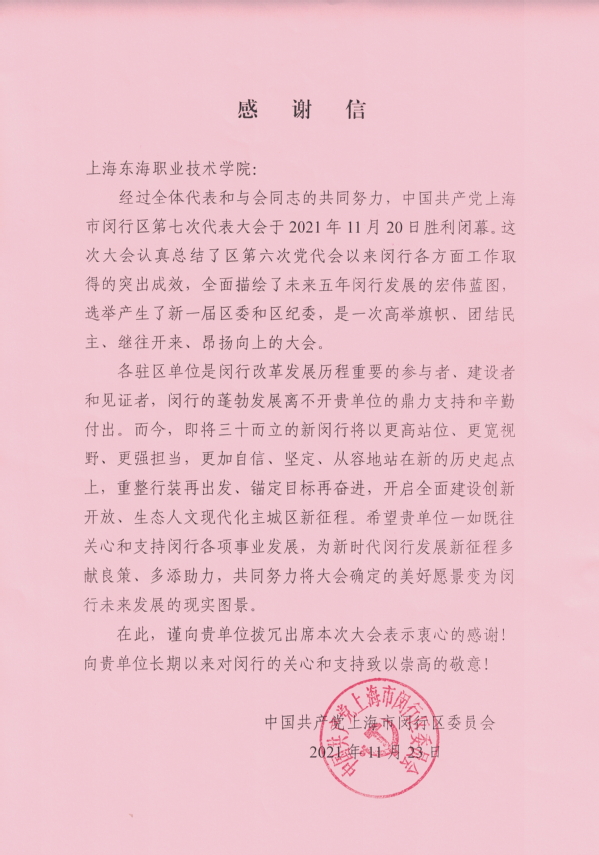 日前,我校收到了中国共产党上海市闵行区委员会发来的感谢信,感谢我校一直以来对新时代闵行发展的关心与支持。