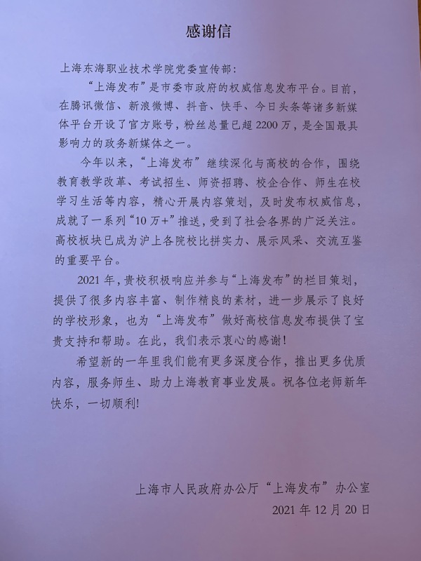 日前,上海市人民政府办公厅“上海发布”办公室给我校党委宣传部发来感谢信,感谢我校积极响应与参与“上海发布”栏目策划,为之做好高校信息发布提供支持和帮助。