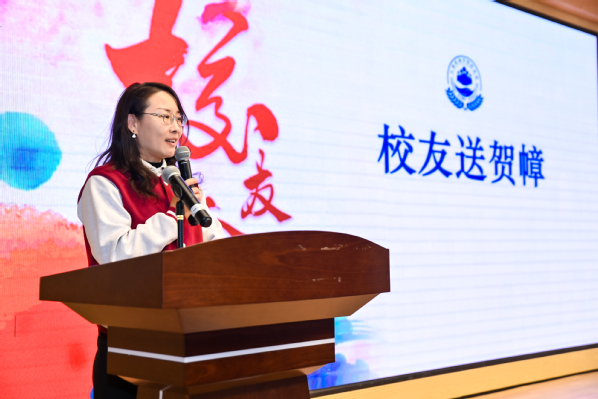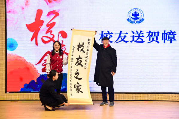 1995级校友、宁波银行上海分行大客户三部总经理石裕向董事长曹助我敬送“校友之家”贺幛并发言。她说,在母校,得益于师长教诲,校友们寒窗苦读、奋发向上,度过了生命中最宝贵的年华,锻造了知识和能力。如今,大家工作有业绩,事业有成长,人生有发展。她倡议校友们增进彼此间的交流,团结互助,合作发展,共同为母校发展奉献自己一份力量。