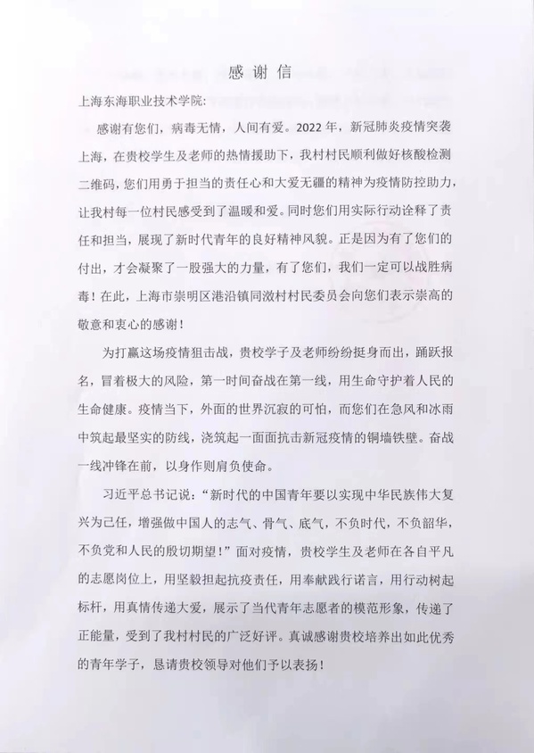 3月21日,学校收到了崇明区港沿镇同滧村村民委员会发来的感谢信,感谢我校师生为同滧村第二轮核酸检测快速高效完成提供支持与助力。