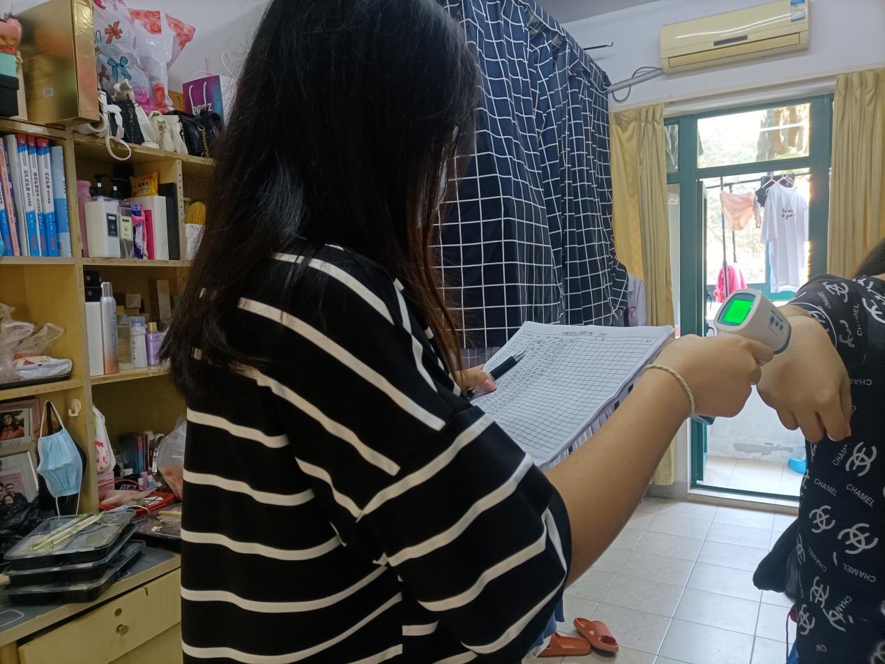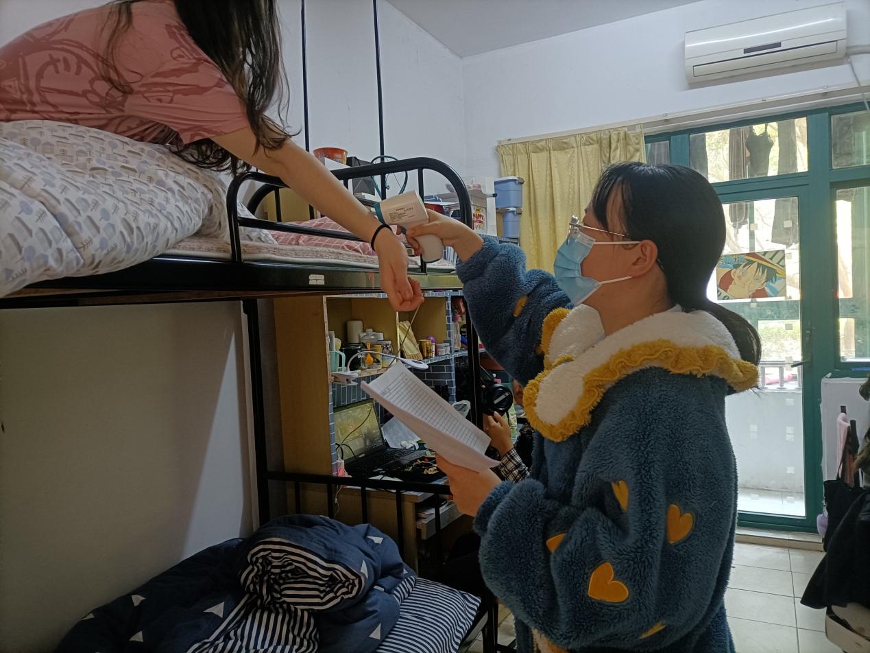 除了三餐的分发,我们的工作还包括每天给宿舍的同学量体温,做好日常健康观察。