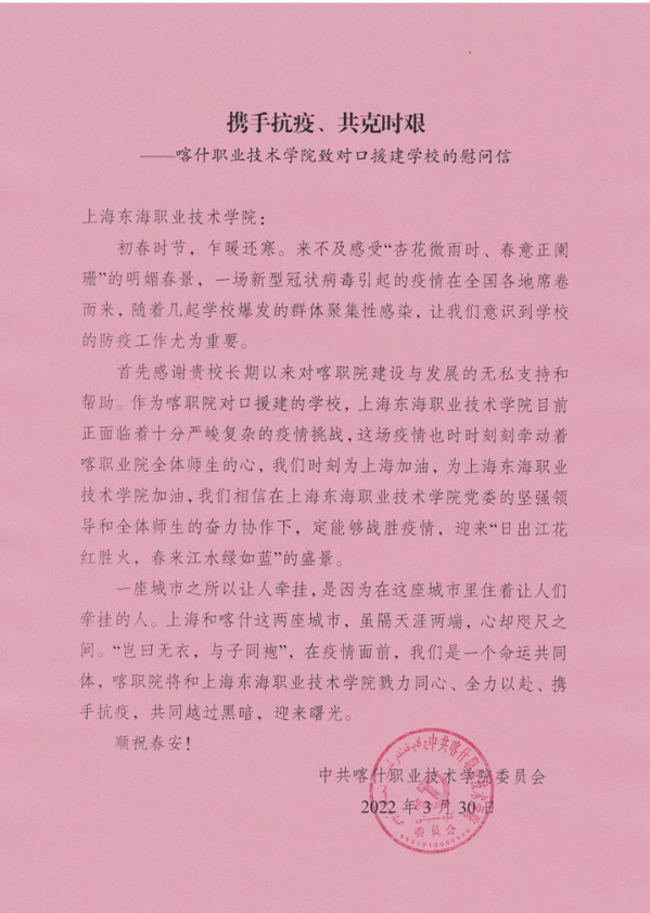 4月1日,我校党委收到了中共喀什职业技术学院委员会发来慰问信,字里行间流露出对身处严峻疫情之中东海学院全体师生的深刻关切。信中说:“一座城市之所以让人牵挂,是因为这座城市里住着让人们牵挂的人。”“喀什职院将和上海东海职业技术学院勠力同心、全力以赴、携手抗疫,共同越过黑暗,迎来曙光!”