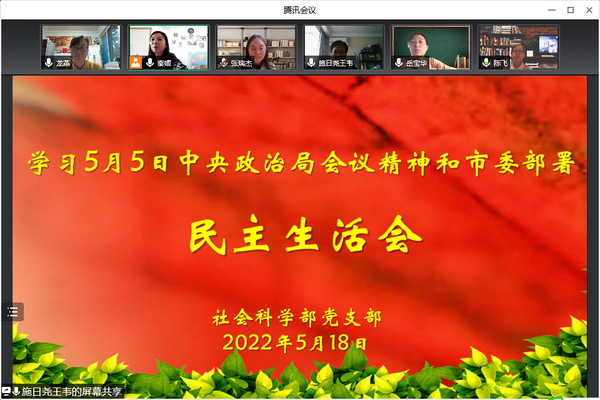 518日,社科部党支部召开线上民主生活会,专题学习55日召开的中共中央政治局常务委员会会议重要精神。社科部党支部6名党员到会参加学习(1人病假)。