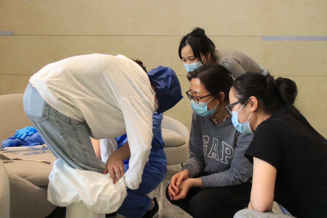 从15日接到实操培训任务后,护理学院就开始精心准备培训教案,将穿脱防护服的步骤做成了流程图方便志愿者们记忆。“由中间至两边按压,使其紧贴鼻梁,双手完全覆盖住口罩,快速呼气,检查口罩四周有无漏气。”两位老师为现场志愿者们演示手部清洁、防护服穿脱、进行鼻拭子、咽拭子采样讲解;志愿者两两一组开始练习。最后对志愿者进行防护服穿脱、鼻拭子采样、咽拭子采样考核。培训考核后,党委书记曹蓉蓉对护理学院及志愿者们的辛勤付出表示感谢,希望大家课后巩固实操要点,努力消化培训内容,日后积极投身于校园核酸采样队伍中,共建无“疫”东海。