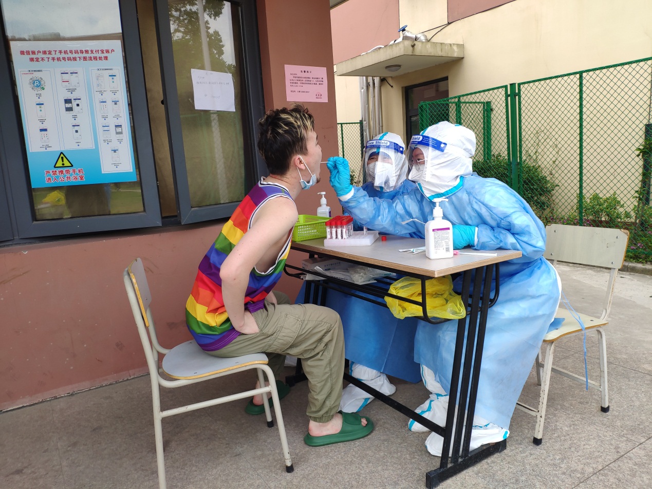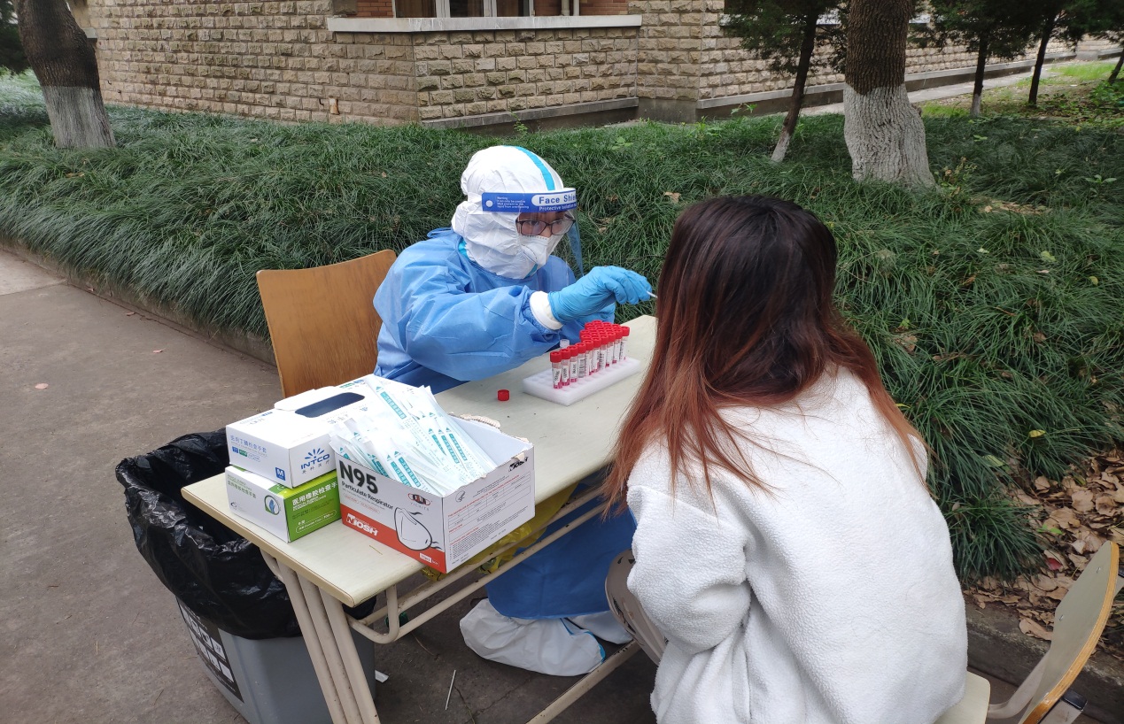 今天,是我培训后第一次正式上岗,心里还是免不了有些紧张和忐忑”。艺术设计学院党支部书记万黎黎在护理学院张丽的指导下,两个人完成了女生4号楼443人的采样。“采样工作看似简单易懂,但在实际操作时有很多需要注意的地方。采样的区域对不对,手势力度够不够,这些都是第一次上手的我心中关注的点。”万黎黎说。
