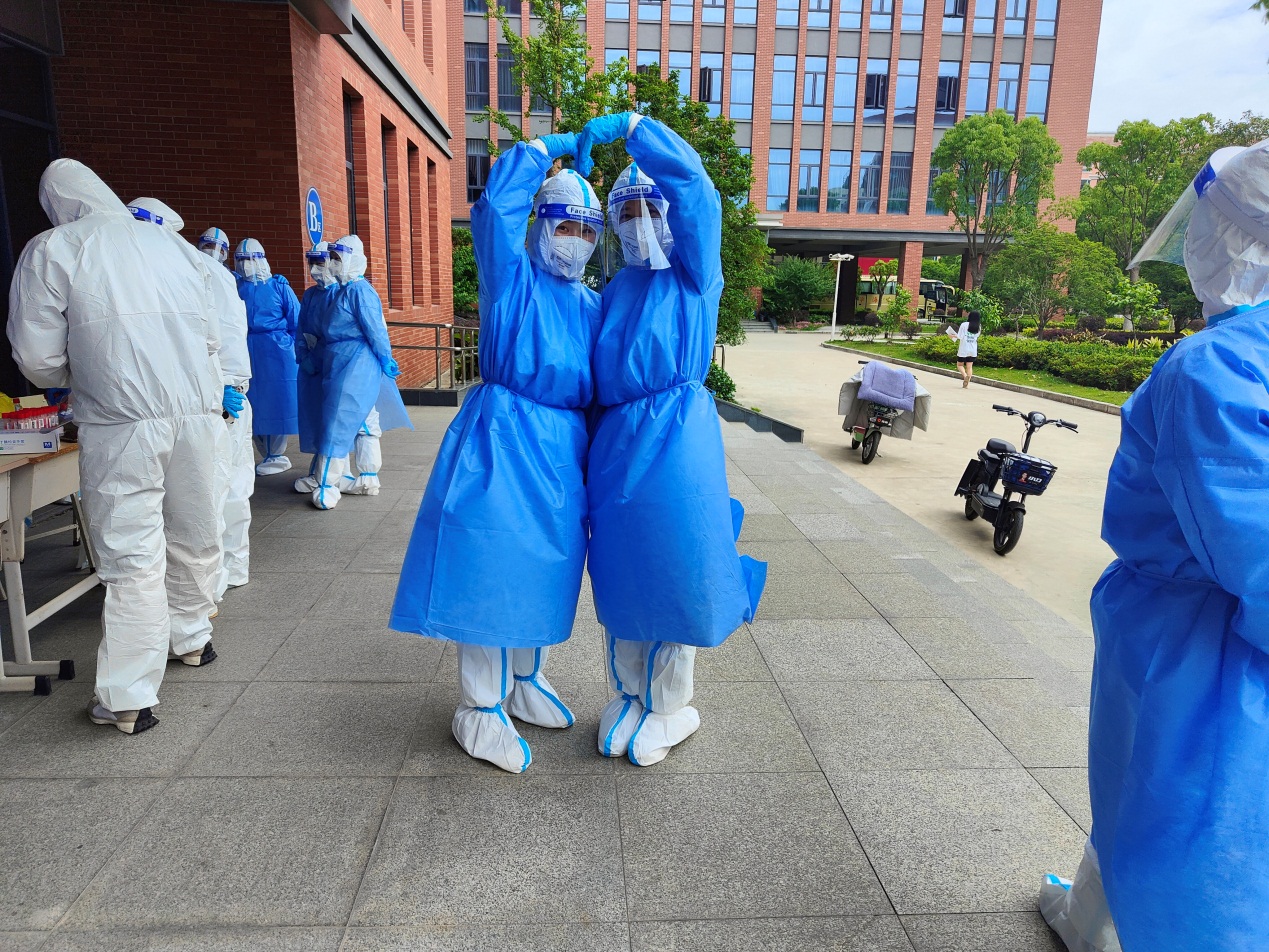 最好的教学是实践,感谢各位专业老师们严格培训,让我们感受到做核酸的第一视角,体会到了在防护服里被汗水的‘包裹’。相信我们一定能打赢这场疫情阻击战。”机电学院辅导员孙菁如是说。