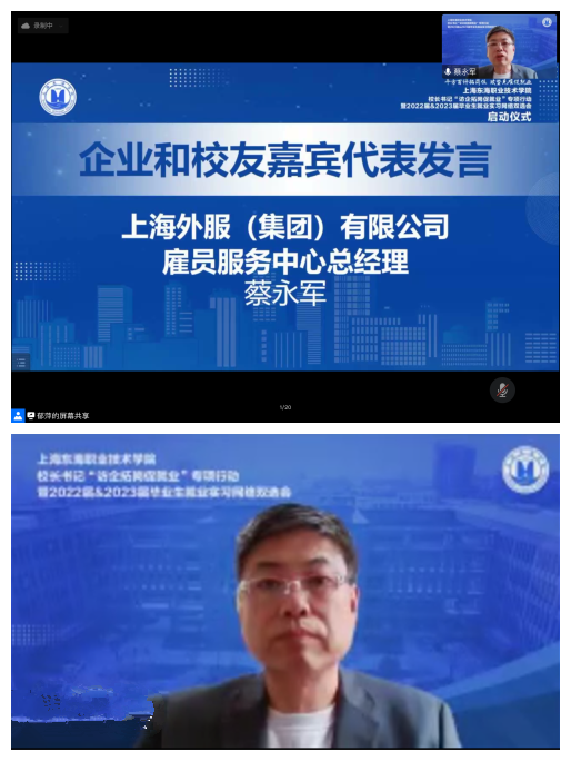 此次活动邀请到闵行人力资源和社会保障局副局长唐治国,上海市就业促进中心副主任沈浩,上海市学生事务中心副主任周红星,闵行区就业促进中心主任陈铁民,吴泾镇社区事务受理服务中心党支部书记、副主任李慧,上海外服(集团)有限公司雇员服务中心总经理蔡永军,上海凌琛供应链管理有限公司创始人、2003级校友曹健莅临指导,校长王刚、党委书记曹蓉蓉、副校长郁萍出席活动现场,学校二级学院主要领导、师生代表共计300余人共同参加线上启动仪式。活动由副校长郁萍主持。