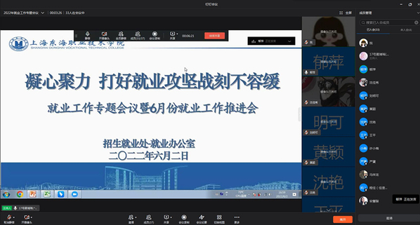 会上,就业办主任张春首先从学校整体和二级学院两个层面通报了我校2022届毕业生目前的就业工作进展情况。她指出,就业工作已进入加速冲刺的关键阶段,由于疫情影响,2022届毕业生就业工作正面临着疫情防控常态化以来形势最严峻的一次考验,近期通过全校师生的共同努力,我校2022届毕业生就业工作相对平稳。但就业工作仍未结束,关键阶段仍然有大量艰巨任务需要与会教师们凝心聚力来完成,并特别针对2022届毕业生全日制专升本考试工作事宜、持续做好毕业生就业状况统计、落实好未就业毕业生的就业推荐、做好毕业生报到证集中派遣工作和开展毕业生就业跟踪调查等就业服务工作进行了部署,依据时间节点,重点对下阶段2022届毕业生各项工作进行了梳理与解读。她希望学校就业战线的教师们务必认真领会落实会议精神,严格遵守上级部门要求,提高责任感,千方百计做好2022届毕业生就业工作。线上参会人员对会议内容进行了深度研讨与交流。
