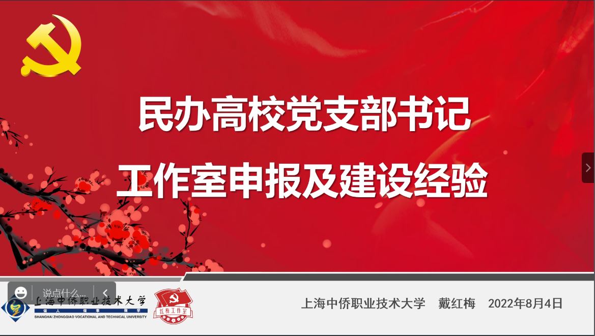 戴红梅书记所在的教师党支部,在2019年获准上海市教师党支部书记“双带头人”工作室,并在2022年评为“全国样板党支部”,她在“双带头人”党支部建设方面积累了大量工作经验。培训会上,戴书记以《民办高校党支部书记工作室申报及建设经验》为主题,从上级政策、工作方法和相关实践等方面,介绍了所在党支部的建设情况,并系统地说明了其“双带头人”工作室的工作模式、主要做法和“四个层级、八个基本要素”整体运行模式。