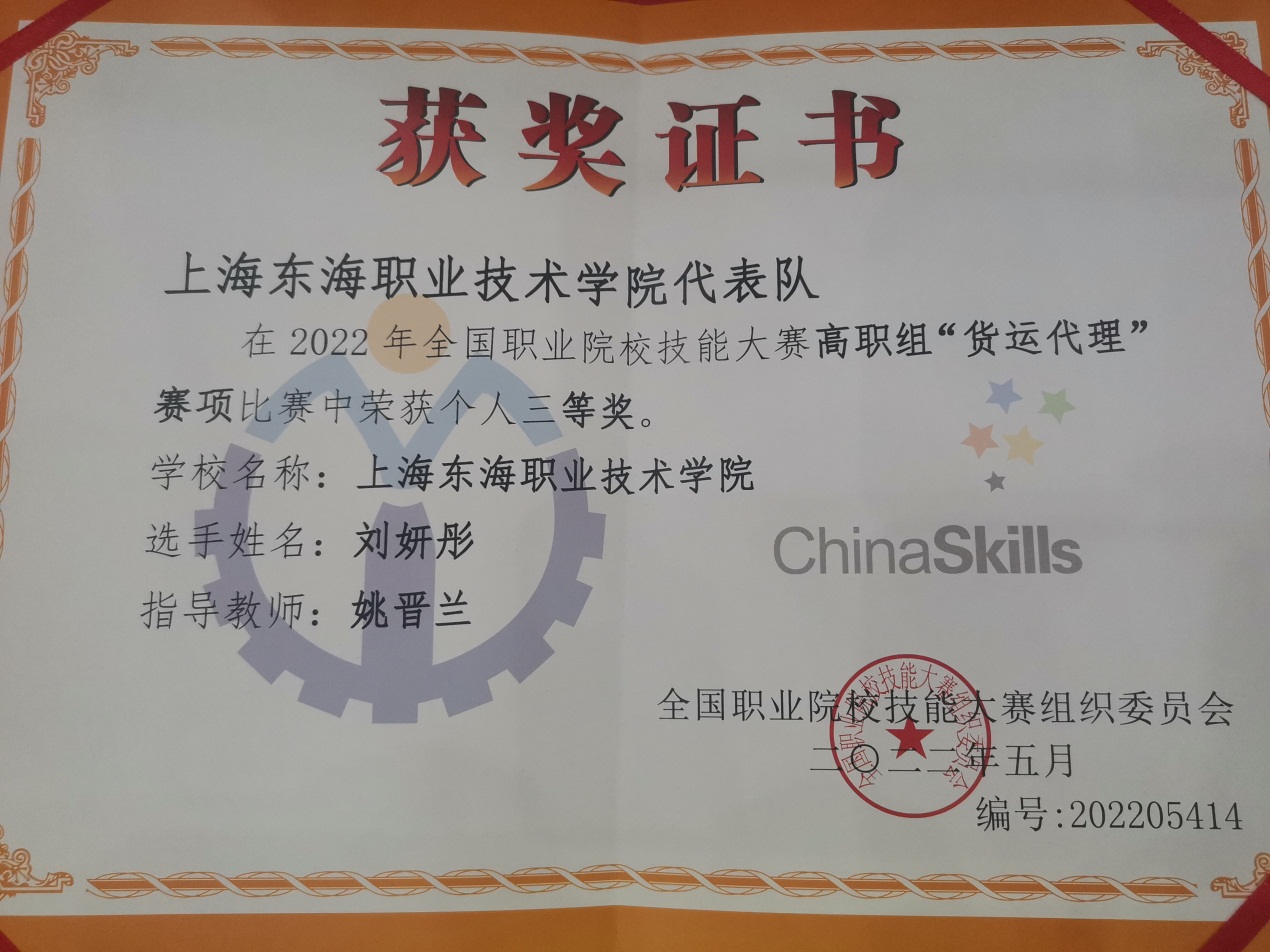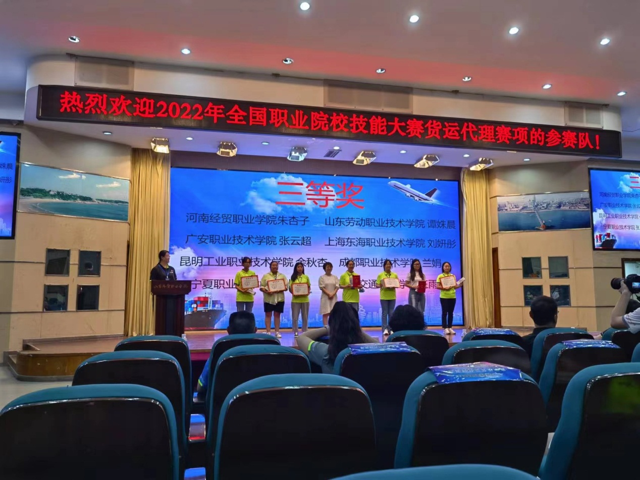 8月17-19日,2022年全国职业院校技能大赛高职组货运代理赛项在山东外贸职业学院成功举办,来自全国的54支代表队同台竞技,我校经管学院关务211班学生刘妍彤经过两天奋力拼搏,获得该项竞赛个人三等奖。