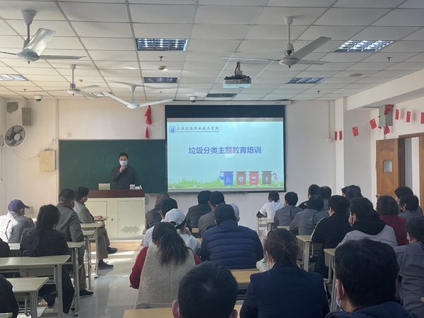 后勤服务中心张智捷作垃圾分类主题教育培训,他首先向大家介绍了垃圾分类的意义、垃圾的处理方式和生活垃圾管理的减量化、资源化、无害化原则,接下来对《上海生活垃圾管理条例》和生活垃圾四分类做了重点讲解。他还介绍了学校在垃圾分类推进工作中优秀的经验和方法。保卫处蒋久泉发言,要求做好今冬明春的防火防寒工作。