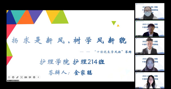 参评班级代表通过PPT答辩的形式,从班级风采、日常管理、参与活动、获奖情况等方面进行答辩,汇报一年来班级学风建设方面取得成效,充分展示了班级特色和班级风貌。他们在班级日常管理方面介绍了一些好的活动和做法,如:制定班级学风制度,建立班级学习小组,组建线上答疑群,积极组织参与学校、学院组织学风主题活动,形成人人参与,通力合作的情况。此外,班级围绕技能竞赛、考级、考证氛围营造等做了精彩展示和分享。评委根据考核指标和现场表现进行打分,参会答辩师生共同参与投票,拟推机电211、学前217、护理214、空乘213、会计212为本次“十佳优良学风班级”.