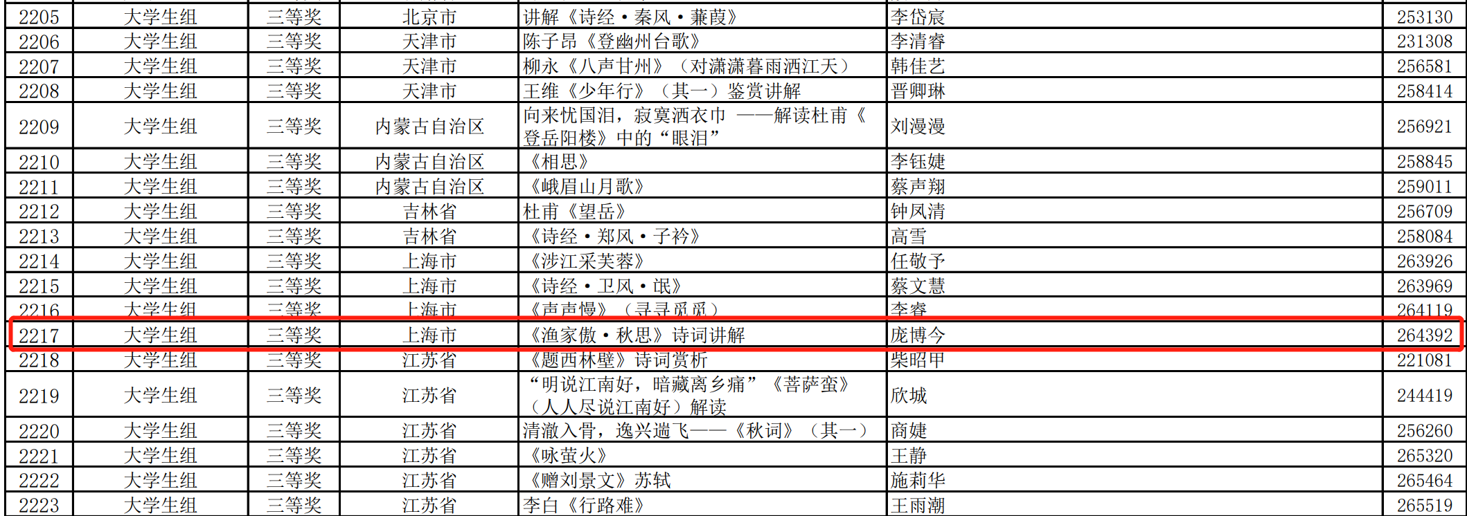 1月12日,由教育部、国家语言文字工作委员会联合主办的2022年第四届中华经典诵写讲大赛“诗教中国”诗词讲解大赛获奖名单公布,东海教育学院学生庞博今经过紧张激烈的角逐荣获国赛三等奖。这是我校在该项赛事中首次闯入决赛并获奖,成为此次上海赛区唯一获奖的高职院校。
