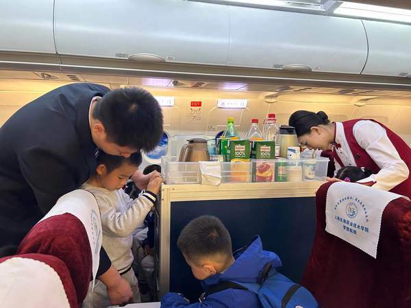 在互动环节,孩子们积极参与,亲身体验了迎客、餐食服务项目以及救生衣的正确使用。在学习过程中,他们兴高采烈地分享本次客舱服务体验,并积极参与航空安全知识的快问快答,救生衣穿戴体验及客舱小食服务更是将本次的活动推向了高潮。有的孩子们说自己虽然体验过飞行的经历,但是对于这种以航空飞行安全为主题的学习体验还是第一次。