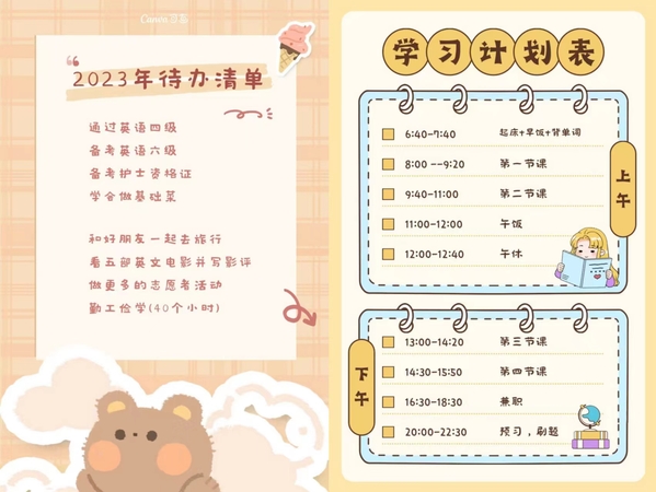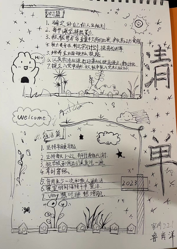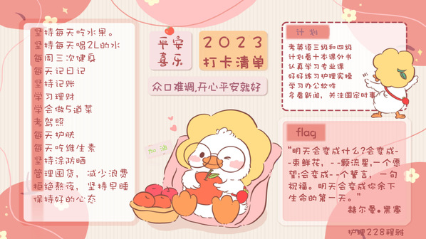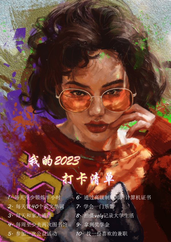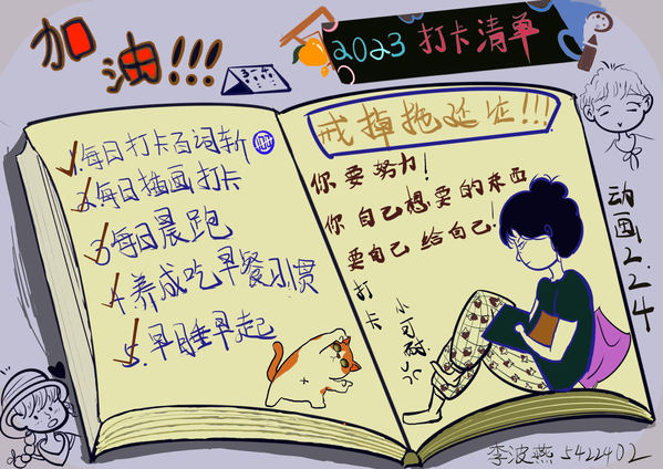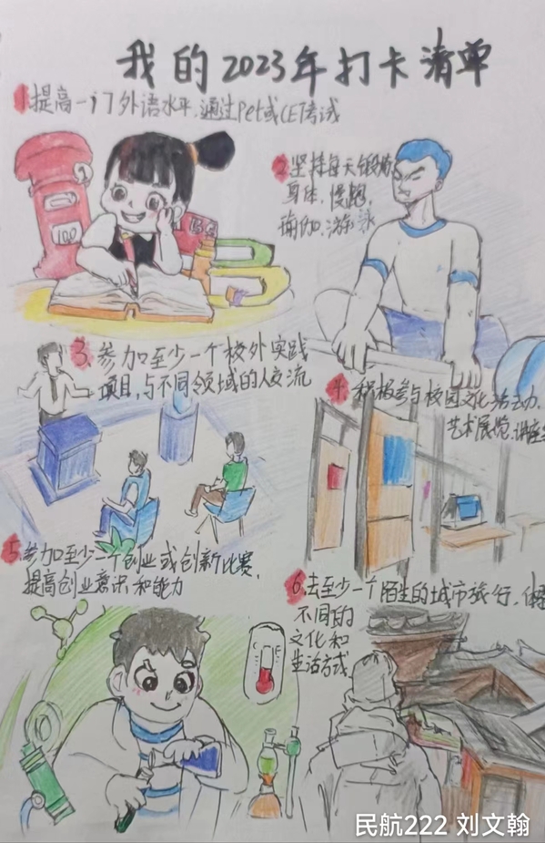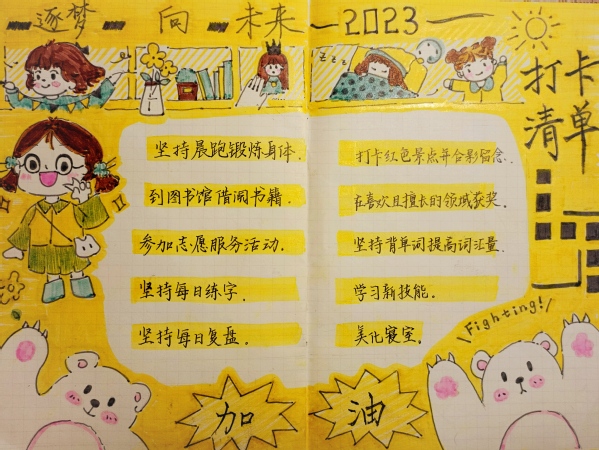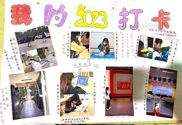 为引导学生“走出宿舍、走出网络、走向阳光、走向健康、走向未来”。3月起,学生工作部开展“追光”行动,号召同学们“一起来做追光者”,共分两项主题活动。其中晒一晒“我的2023打卡清单”活动,鼓励学生制订计划、追逐梦想;踔厉奋发、奔向未来。以良好的精神面貌,推进优良学风建设,迎接校庆三十周年。学生工作部共收到学院推荐作品82份,经过评选18位学生获得“打卡达人”称号,作品展示如下(注:按姓名首字母排序)。
