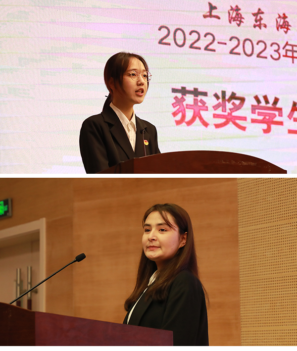 护理学院郑思琪、教育学院热孜完古·吾司曼分别作为获奖学生代表发言。郑思琪以“平凡”为关键词,向大家分享了自己三年来在学习和志愿服务等活动中付出的努力和获得的成绩,向关心和帮助她的老师和同学们表示了感谢;热孜完古·吾司曼代表新疆籍少数民族学生,表达了来上海读书的不易和自己对学习的热情、对荣誉的珍惜,特别感谢国家和学校对学生的奖助政策。