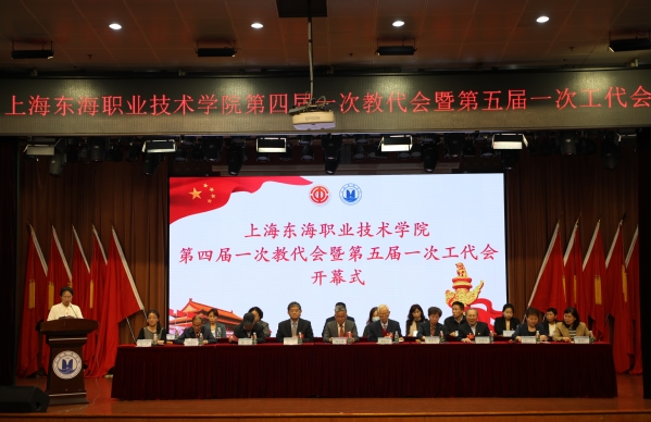 5月9日下午,在庄严的国歌声中,上海东海职业技术学院第四届一次教代会暨第五届一次工代会在东海源大楼报告厅拉开帷幕,主席团成员在主席台就座,正式代表出席会议,部分教职员工列席会议。上海市教育工会副主席陶文捷和基层工作部沈瑶、邬敏懿应邀出席会议。大会秘书长刘静主持。