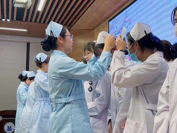 护理学院院长张美琴通过视频方式对护生们致以节日的祝福,鼓励大家发扬“南丁格尔精神”,以梦为马,不负韶华。随后,在授帽、宣誓仪式环节,学院教师们为21级护生代表授予象征白衣天使崇高使命的白色燕尾帽,传承象征着“燃烧自己、照亮他人”的南丁格尔精神。“我志愿献身护理事业,奉行革命的人道主义精神,坚守救死扶伤的信念……”铿锵誓言回荡会场,诠释着白衣天使们志愿献身护理事业,肩负救死扶伤使命的信心和决心。之后,学院老师代表颁发护理技能一、二、三等奖,护理技能优胜奖,技能团队优秀干部,2022-2023年度优秀实训室管理员等奖项,通过表彰,激励当代青年,发挥青春榜样力量,在实现中国梦的伟大实践中绽放永不褪色的青春光芒,续写青春华章。