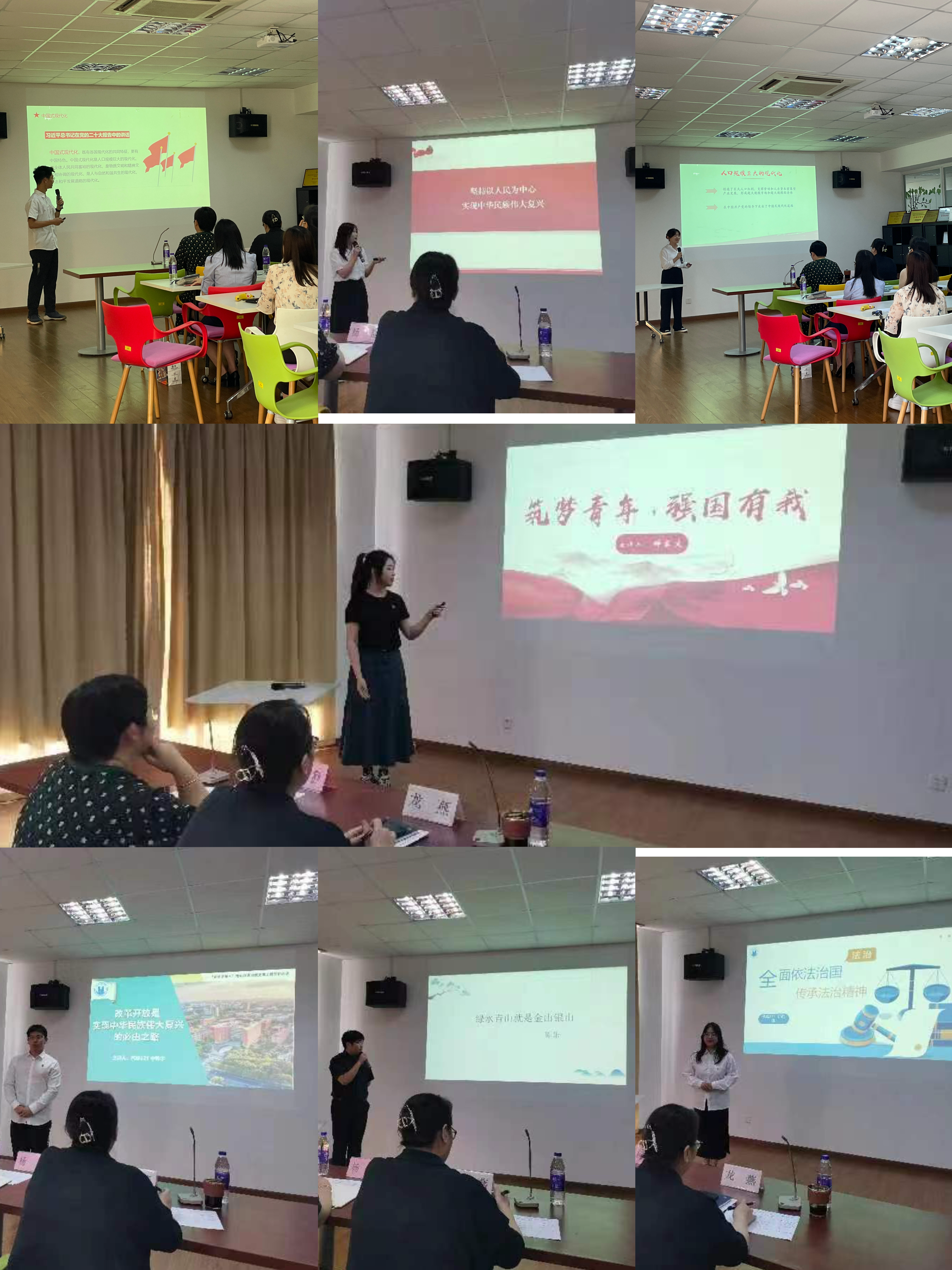 在此次微党课试讲过程中,7位学生各自围绕“中国的现代化之路”(关务221王子涵)、“中国式现代化的五大特征”(学前221蒋雨霏)、“坚持以人民为中心,实现中华民族伟大复兴”(护理223郑瑜珂)、“绿水青山就是金山银山”(机电226陈乐)、“改革开放是实现中华民族伟大复兴的必由之路”(汽修221李晔宇)、“筑梦青年,强国有我”(学前222钟家文)以及“全面依法治国,传承法治精神”(机电222孙钰琳)等七个不同主题展开宣讲,将“书面语”变成接地气的话语,将宏大理论落实落细,从不同视角表达新时代青年的使命与担当。
