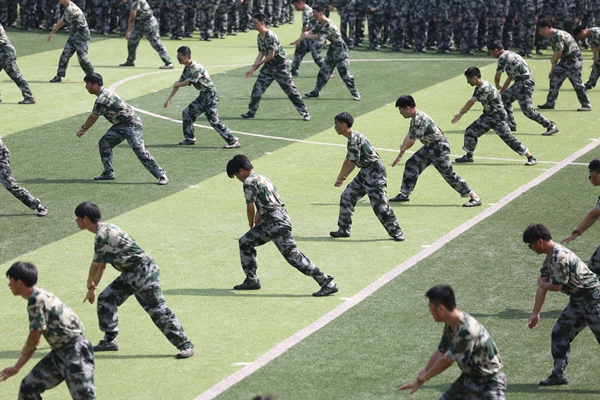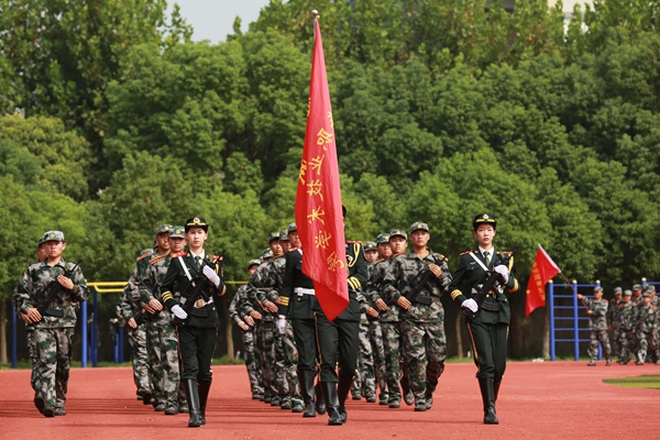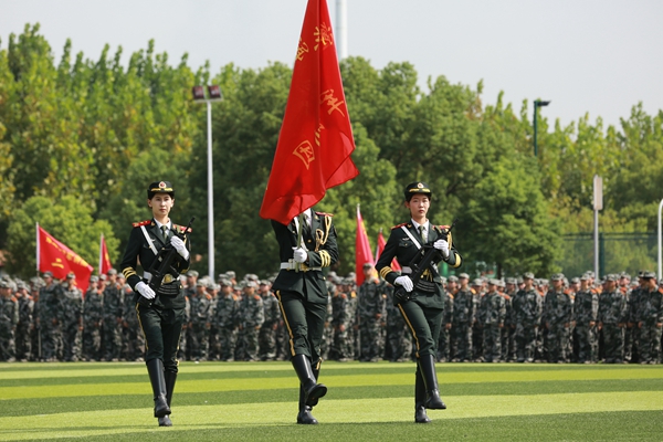 党委书记曹蓉蓉在军训团团长的陪同下,检阅了各营连军训方队,并向受训新生们致以亲切的问候。随后国旗班、各营连方队,高举连旗踏着整齐的步伐,精神抖擞、一展准军人风采,依次通过主席台接受检阅。紧接着军体拳操、捕俘刀二个方队的精彩表演,再次赢得了阵阵热烈掌声。