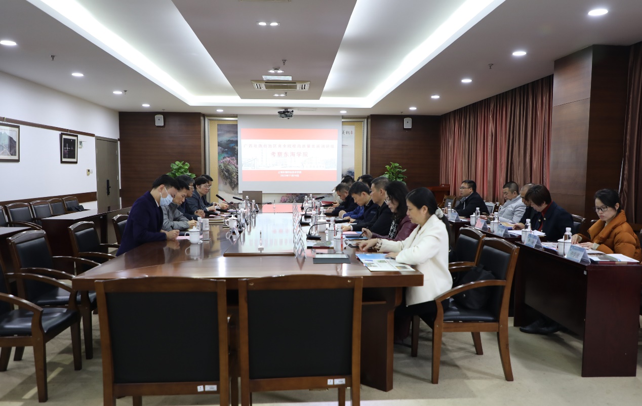 调研座谈会由校长王刚主持,党委书记曹蓉蓉首先致欢迎辞,她对代表团不远千里来到上海,并选择东海学院作为调研学校之一,感到荣幸并表示热烈欢迎;随后,广西壮族自治区商务厅二级巡视员杨勇介绍了本次组团调研的目的和初衷,他指出,本次调研的主要目的是了解和学习上海市职业院校在财经商贸大类专业建设中,推进产教融合、国际化办学、校企合作等方面的创新做法、先进经验;最后,我校经管学院院长严玉康作题为“立足高质量发展 致力专业品牌建设”的主旨报告,重点介绍了我校财经商贸类专业在专业品牌建设、人才培养、校企合作等方面的成功经验和实践感悟。严玉康的报告引起了代表团成员们的浓厚兴趣,各校校长和书记踊跃提问发言,就各自关注的问题与我校人员展开交流讨论,会场气氛热烈。
