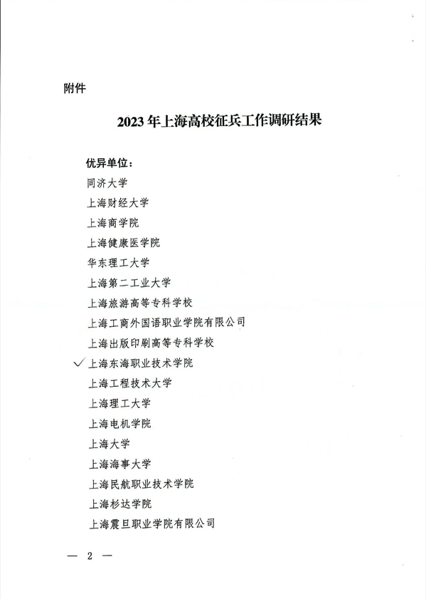 近日,上海市教委公布了2023年上海高校征兵工作调研结果,我校获评2023年征兵工作“优异”等级。2023年我校超额完成了各项征兵工作指标,应届毕业生入伍比例高达94.7%,高标准完成了征兵工作任务。