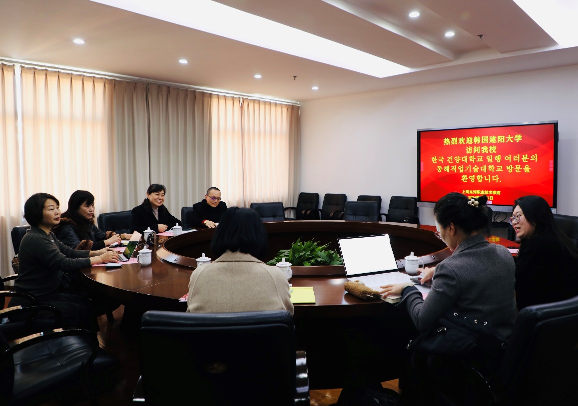 卓丽环首先向来宾简要介绍了上海东海职业技术学院30多年来的建设与发展,重点介绍了学校相关学院及特色化办学、校企合作实行订单式培养、中外合作及国际化人才培养目标等基本情况,希望通过双方的交流与合作形成有效模式,帮助相关专业学生实现深造、提高就业竞争力。苏妍主任简要介绍了建阳大学概况和主要办学特色,重点介绍了韩中合作办学模式、外国人特别课程修读条件和教学安排等情况。李美香院长、张美琴院长分别做了补充说明。双方就继续深入研讨合作细节、及早形成并实质性推进具体合作项目等达成一致意见。