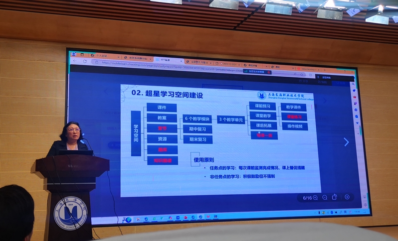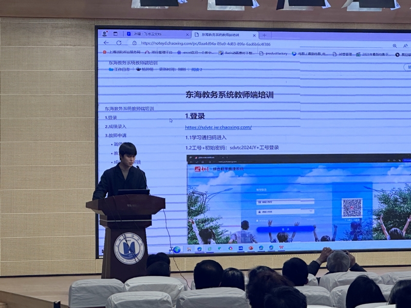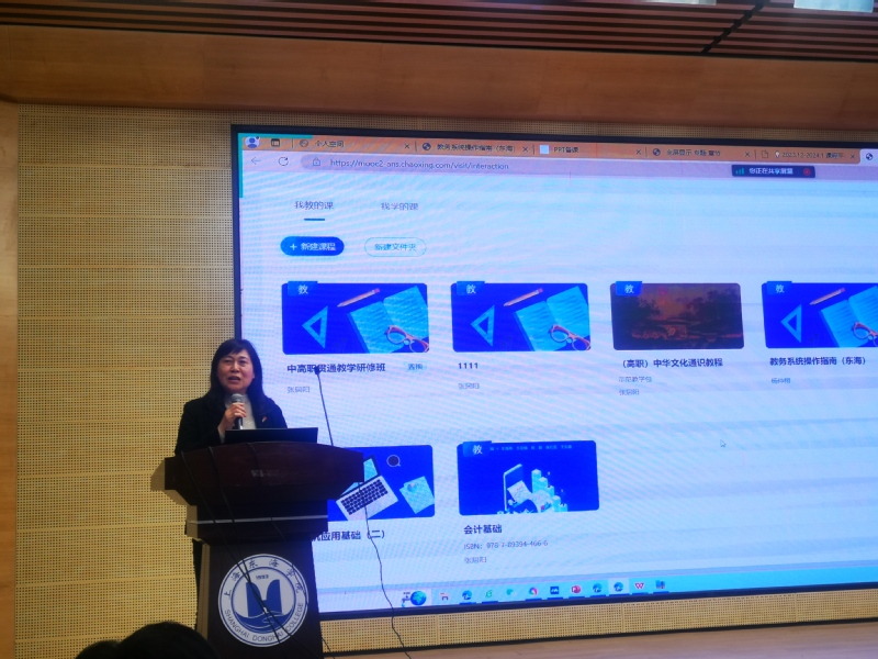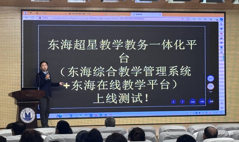 本季培训的主要任务是帮助学校任课教师及教学管理人员全面掌握东海超星教学教务一体化平台各项功能的使用,全面提升专职教师在“学习空间建设”“智慧课堂改革”“在线课程建设”等方面的教学及管理能力,促进信息技术与教育教学融合创新发展。培训通过线上线下结合方式开展,线上培训通过在东海超星平台开设《东海超星教学教务平台使用》在线课程实施,共计7课时,线下培训共计3课时。线下培训课的主题为“东海超星教学平台建设与应用”,内容包括“东海超星教学教务一体化平台使用说明”“应用案例分享”“政策解读”三个部分。首先,超星集团技术经理杨仲栩、史雅倩先后介绍了超星教务和教学系统的各项功能;其后,基础部主任牛晓伟和信息工程学院计算机基础教研室主任罗晓丹先后分享了她们在使用超星平台进行在线课程和学习空间建设中所积累的经验。教务处处长张居阳解读了学校在“教育信息化”方面的政策文件。