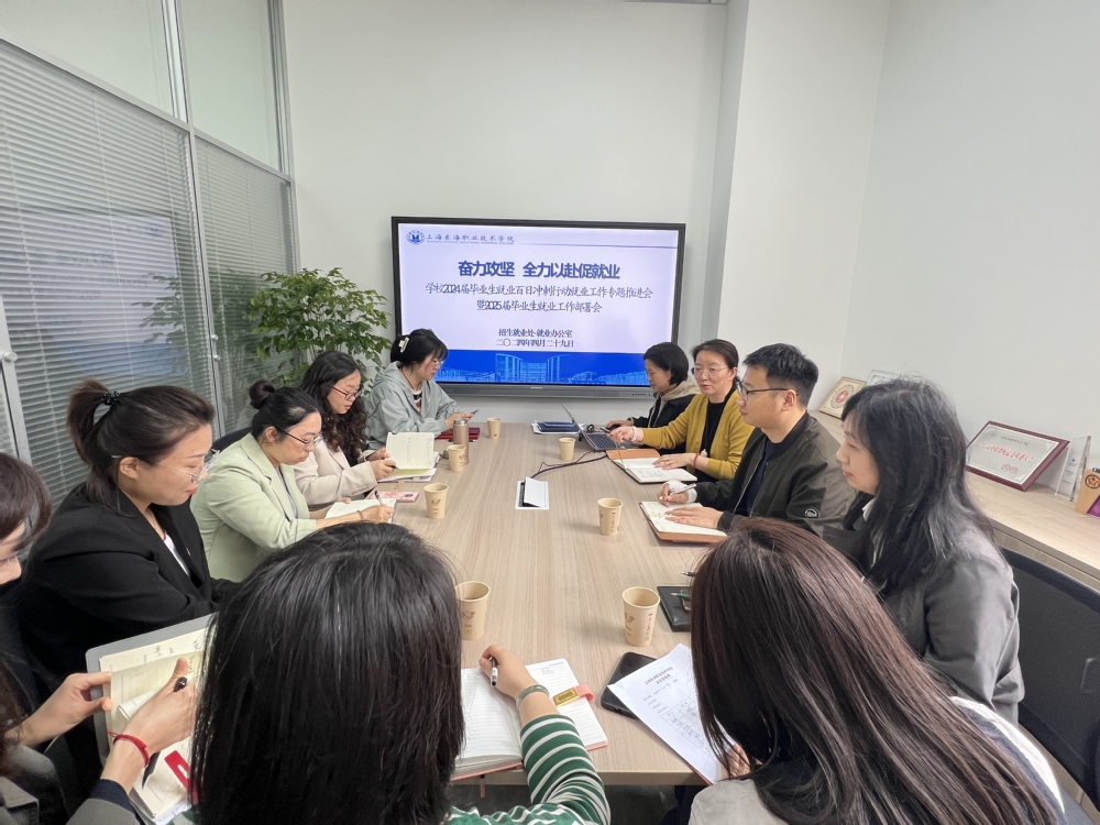 为贯彻落实党中央、国务院关于高校毕业生就业工作的总体部署,认真落实教育部、上海市等相关会议精神和文件通知要求,抓住毕业生就业工作关键期、冲刺期,全力促进毕业生更充分高质量就业,2024年4月29日上午,我校2024届毕业生就业百日冲刺行动专题工作推进会暨2025届毕业生就业工作部署会在东海源南104会议室召开,重点落实我校就业百日冲刺行动具体措施和部署2025届毕业生就业任务。会议由副校长郁萍主持,招生就业处、各二级学院党支部书记参加了会议。
